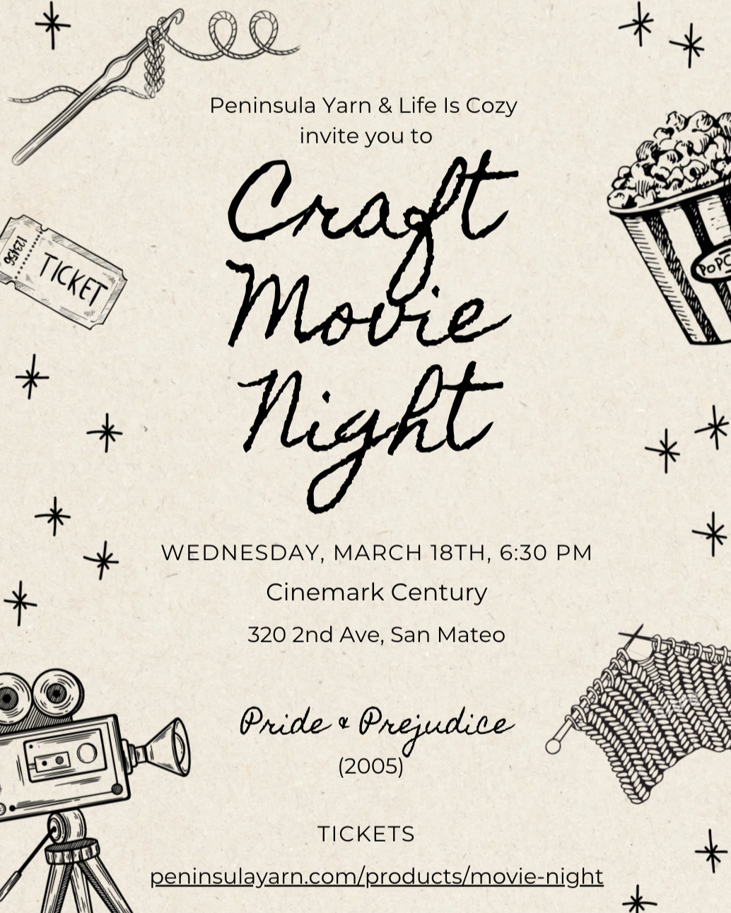Peninsula Yarn & Life is Cozy cordially invite you to an evening of crafting at the movies! Bring your latest knitting, crochet, or any craft-y project and join us for a private screening of Pride & Prejudice.