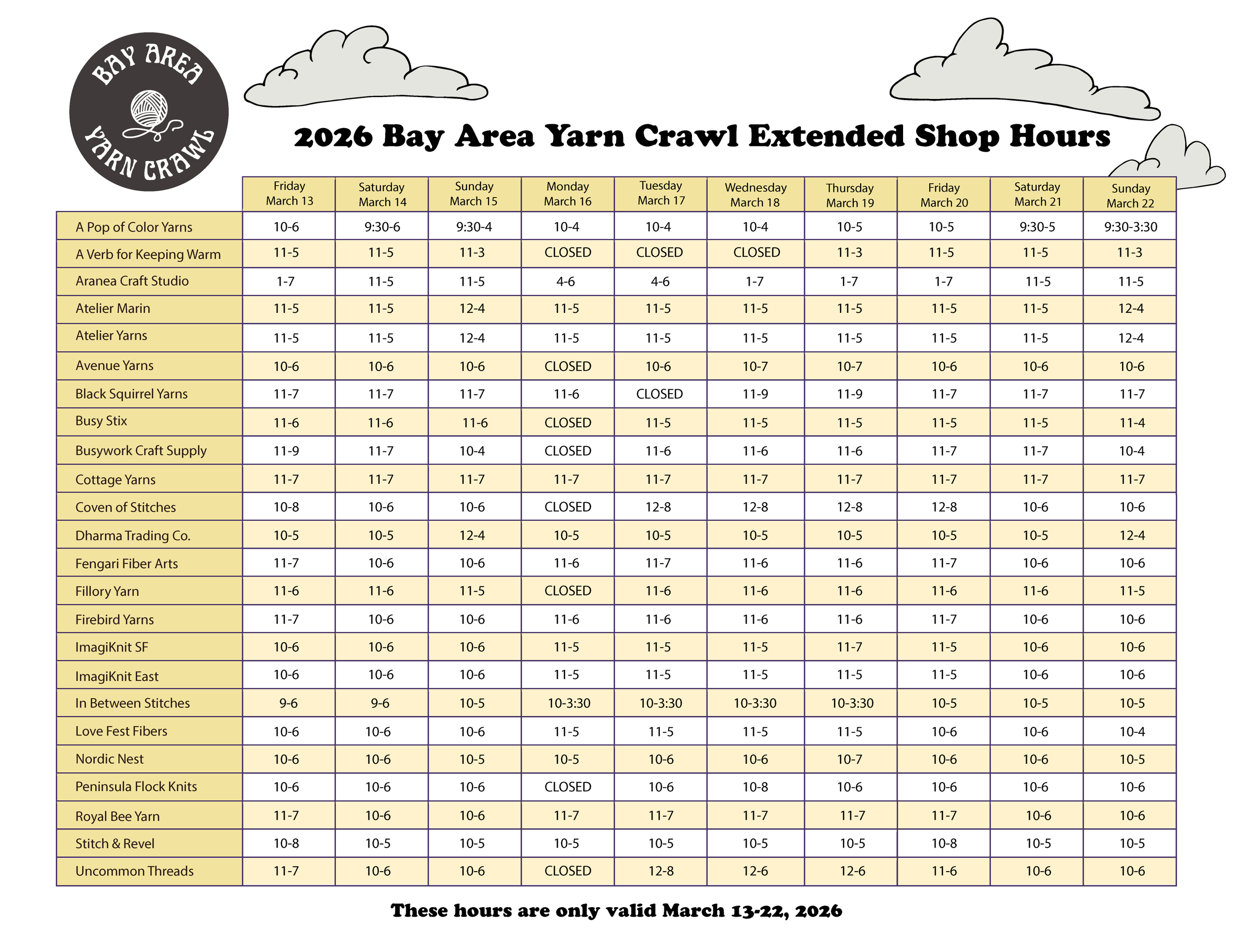 Shops are open extra hours for the 10 days of the Bay Area Yarn Crawl. Scroll to download a printable PDF version, for your off-line reference.